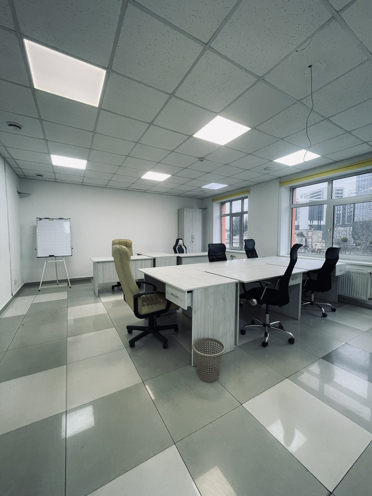 Офіс має просторе планування з великими робочими зонами, що дозволяє зручно організувати робочі місця для команди. Великі панорамні вікна забезпечують багато природного світла, створюючи приємну атмосферу для продуктивної роботи.