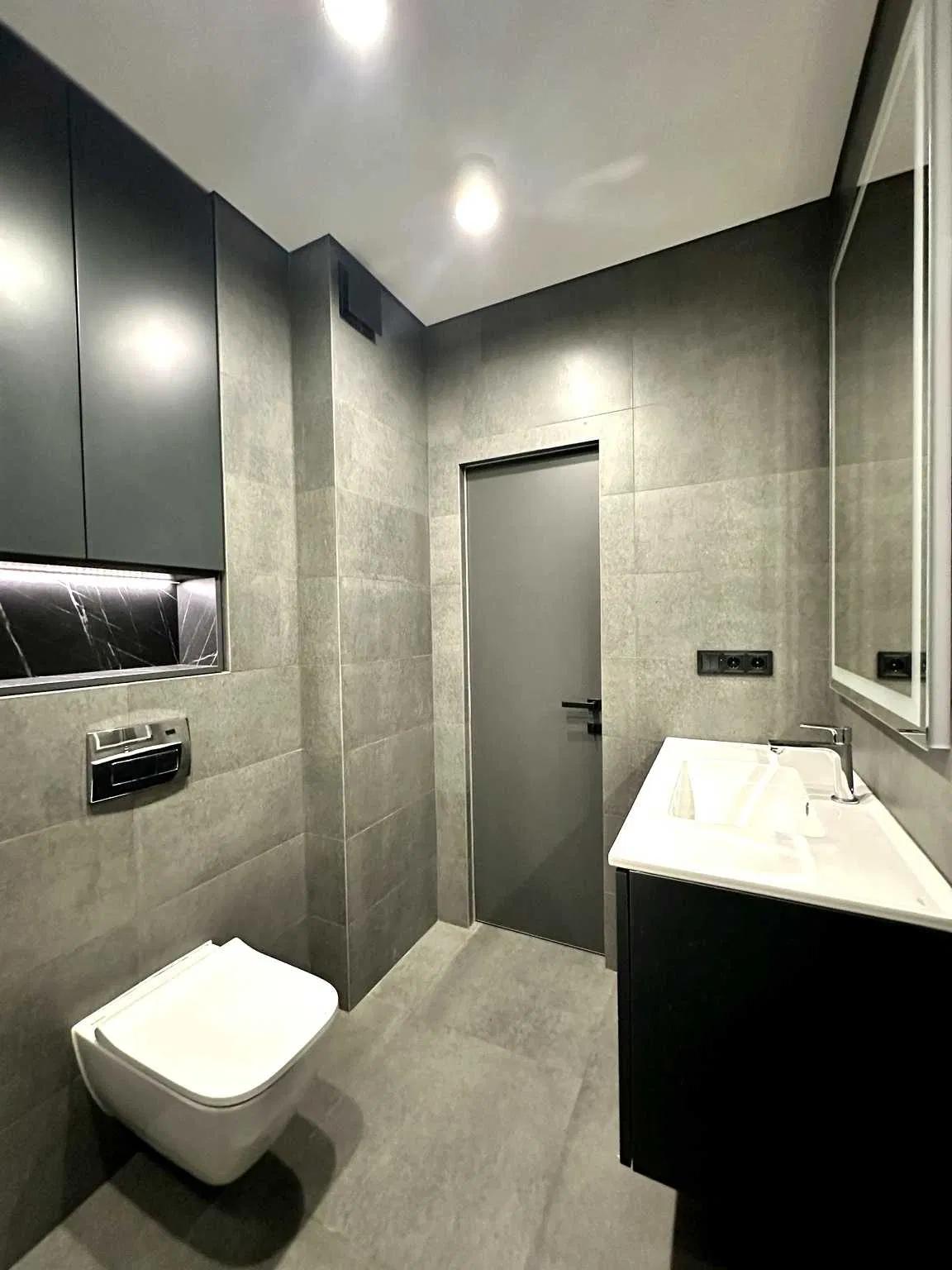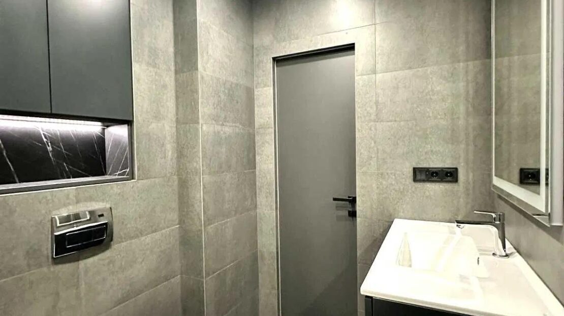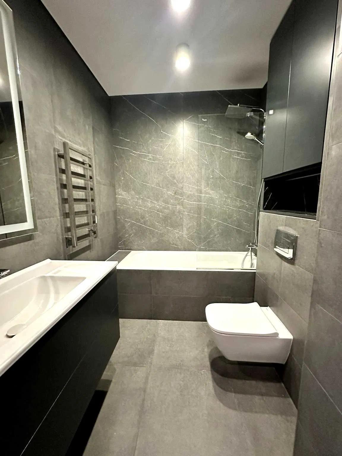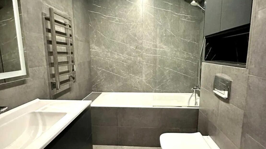 великоформатна плитка під мармур у ванній кімнаті;