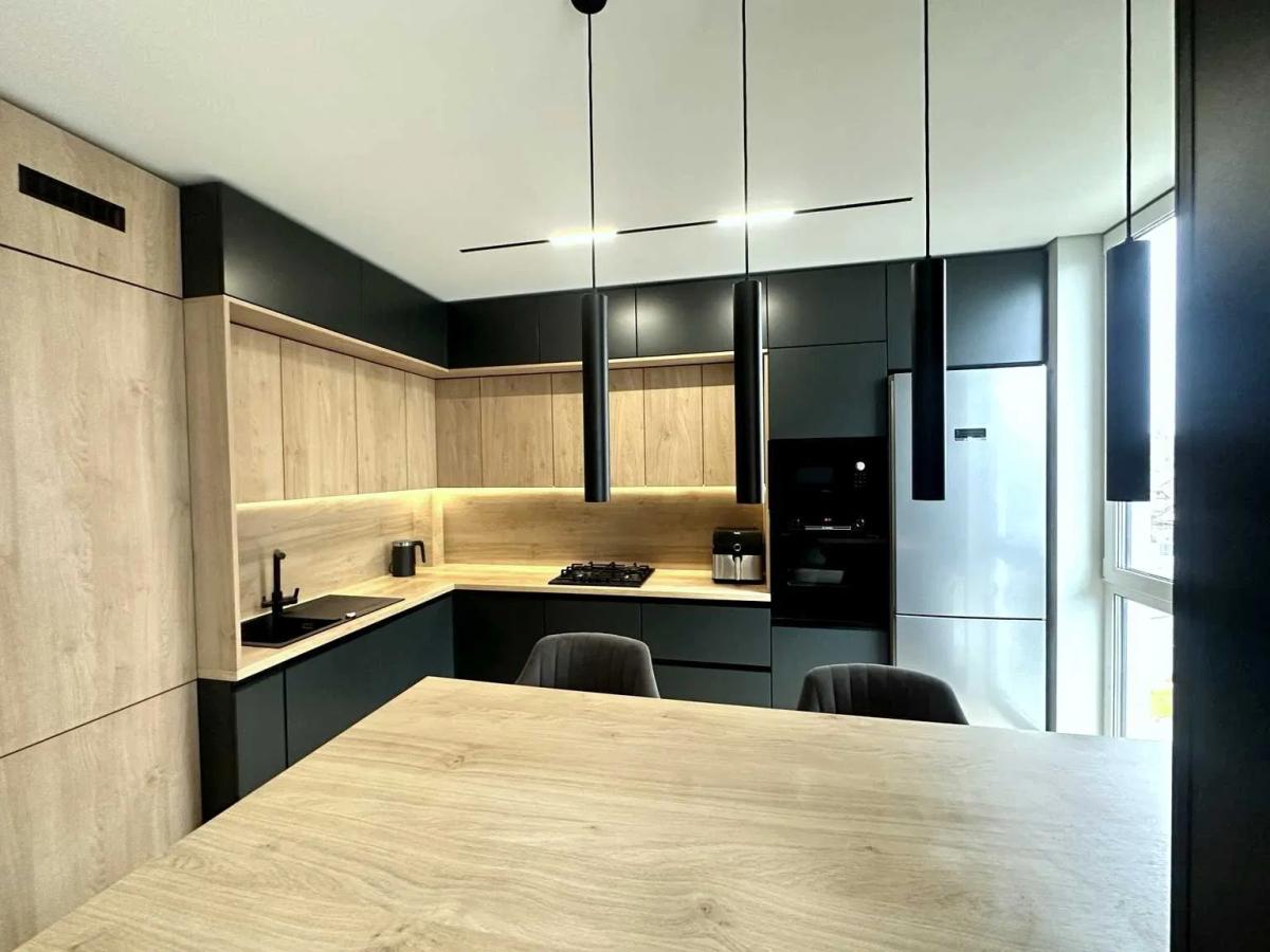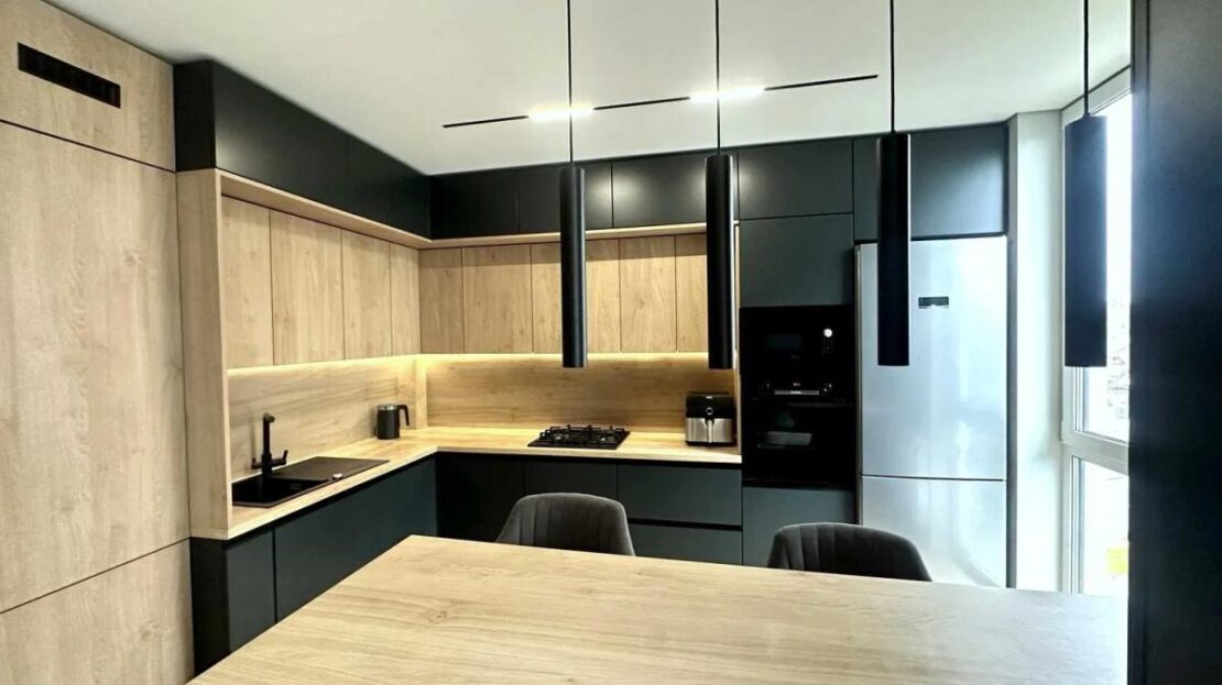 кухня з темними матовими фасадами та дерев’яними рейками;