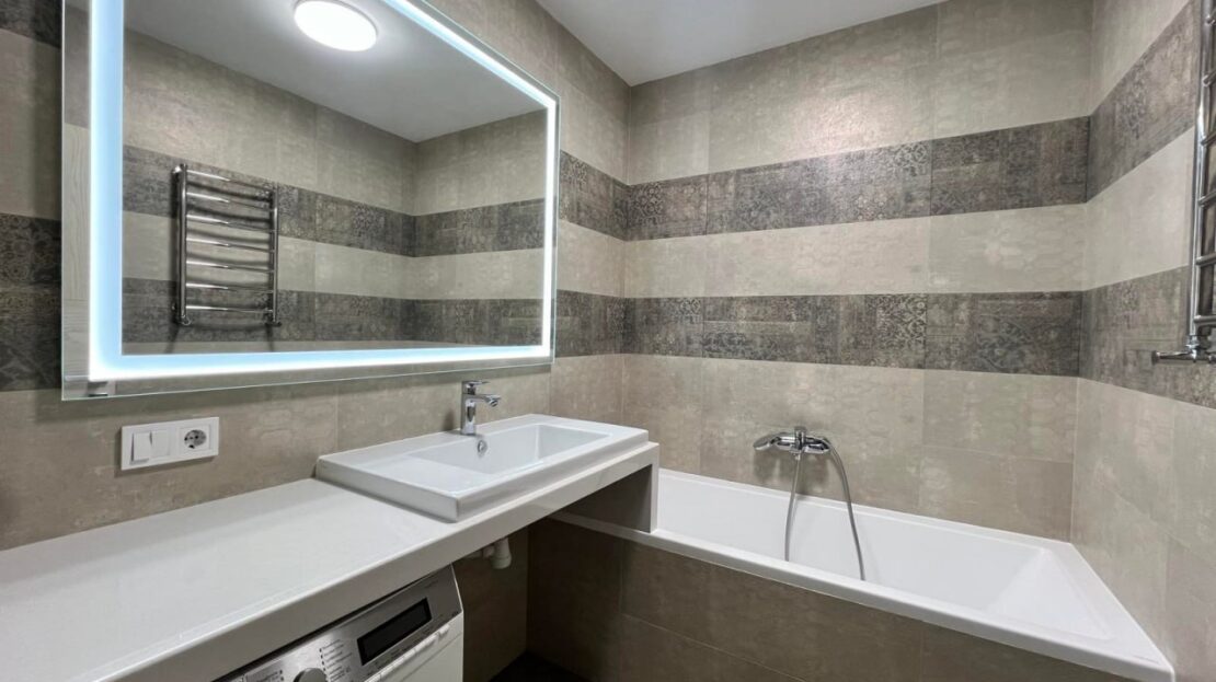 Площа 127 кв.м., 8/10 пов. 1-й рівень: кухня з підігрівом підлоги, вітальня, спальня, гостьова/кабінет, санвузол + окрема ванна, балкон з видом на місто. 2-й рівень: дитяча кімната/спальня, санвузол з душем, гардеробна/сховище.